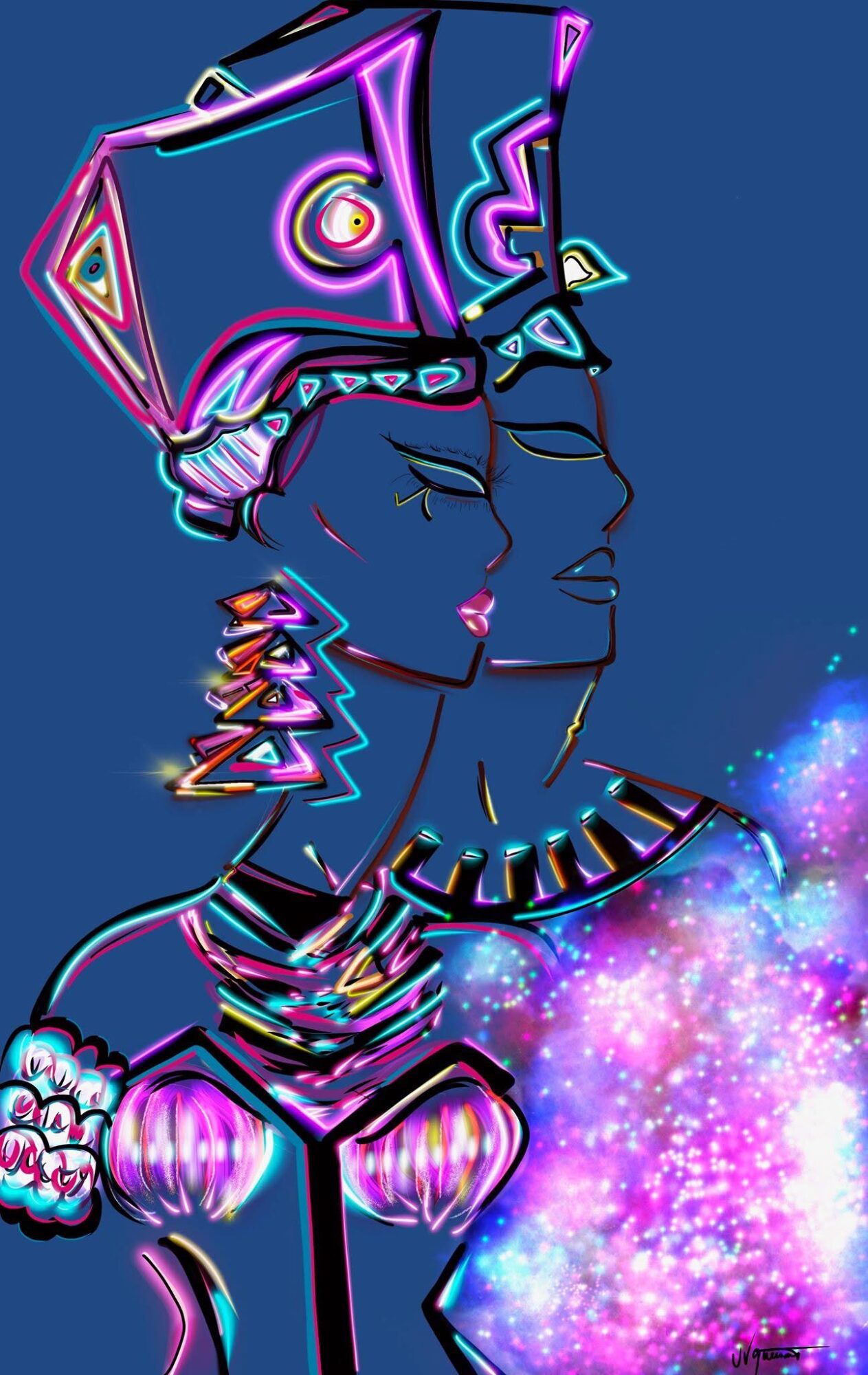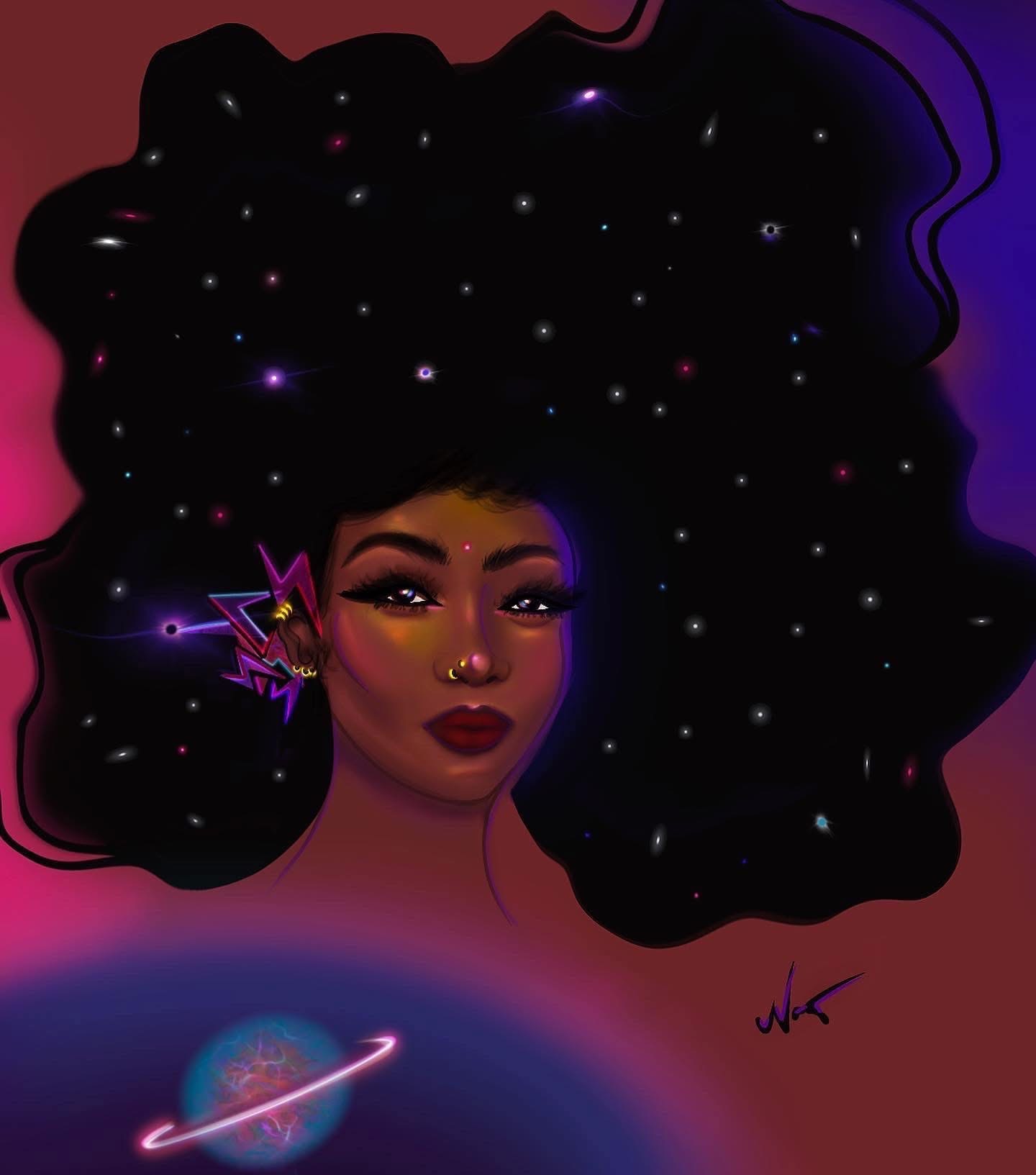 I am inspired to create by living authentically through life’s experiences and adventures, while keeping a youthful, childlike curiosity at heart. My artist nickname was inspired by my favorite color, violet, which represents one of the most creative auras one can embody. I believe every woman is a queen in her own right. Early in my career as a visual artist, one of my main focuses was to inspire Black women and women of color—to allow them to marvel at and see themselves within my creations. I was drawn to illustrate this and reflect it in my artist name, which began as Ultra Violet Queen Art and later evolved into Ultraviolet, also known as Ultraviolet Aesthetics.