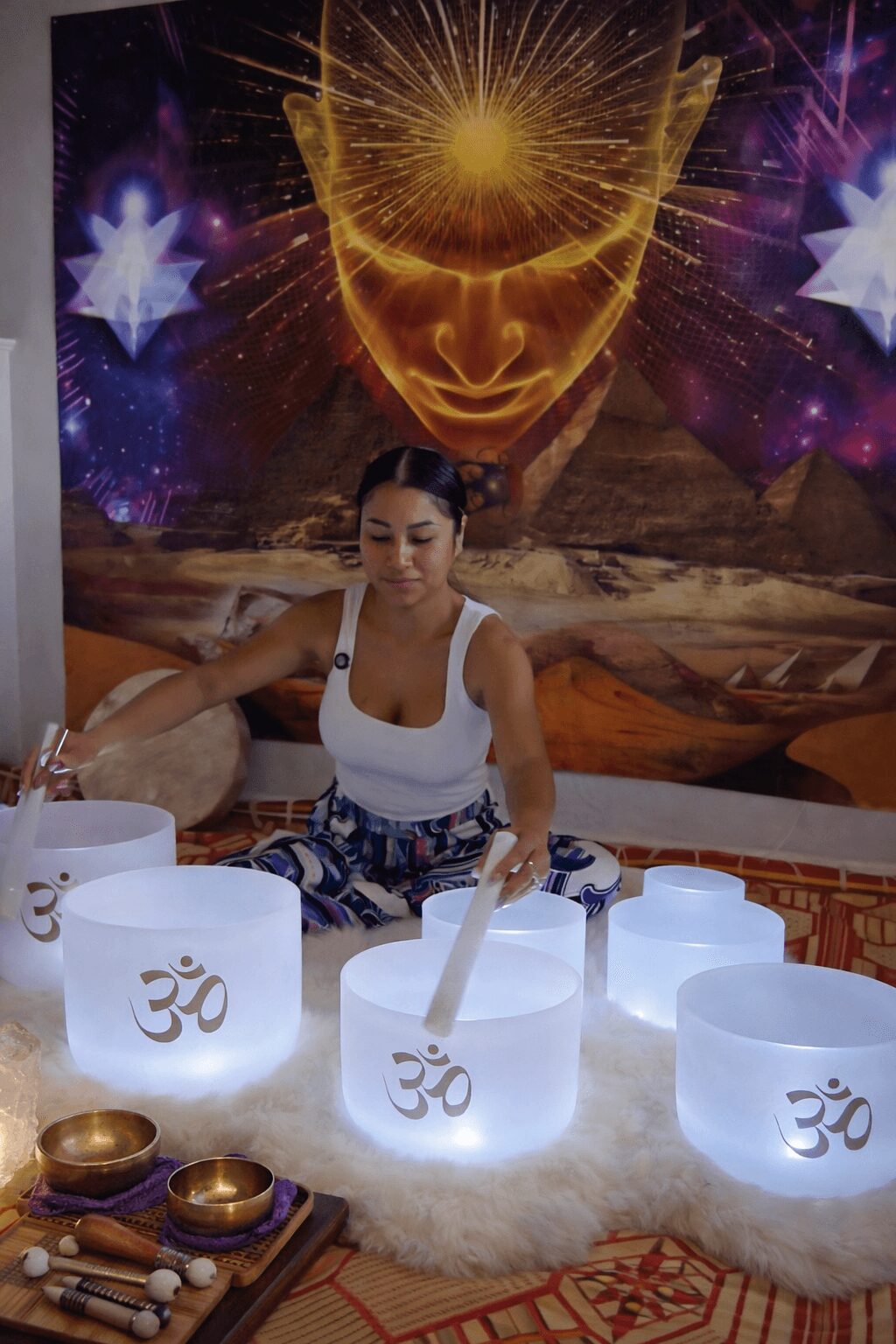 My services include Cosmic Sound Healing, where I use crystal singing bowls, my shamanic drum, and my own voice to transmit healing frequencies that actively clear tension and rebalance the body’s energy field at a cellular level. Unlike meditation, which requires effort and focus, sound healing is a receiving experience. You simply allow. The vibrations do the work.