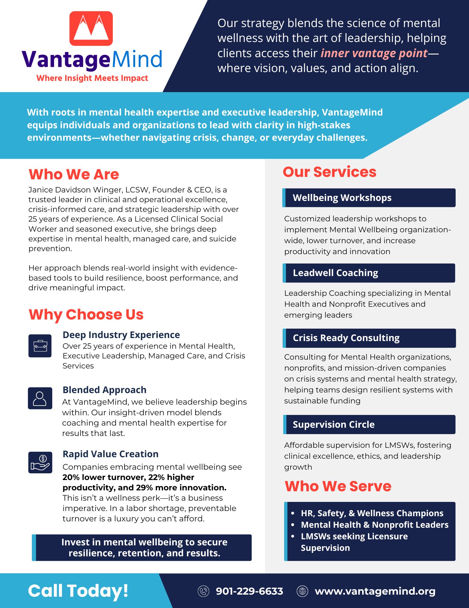 Ultimately, VantageMind is about helping people rediscover what it means to lead with heart, clarity, and courage. Because when leaders are well, organizations thrive—and so do the communities they serve.