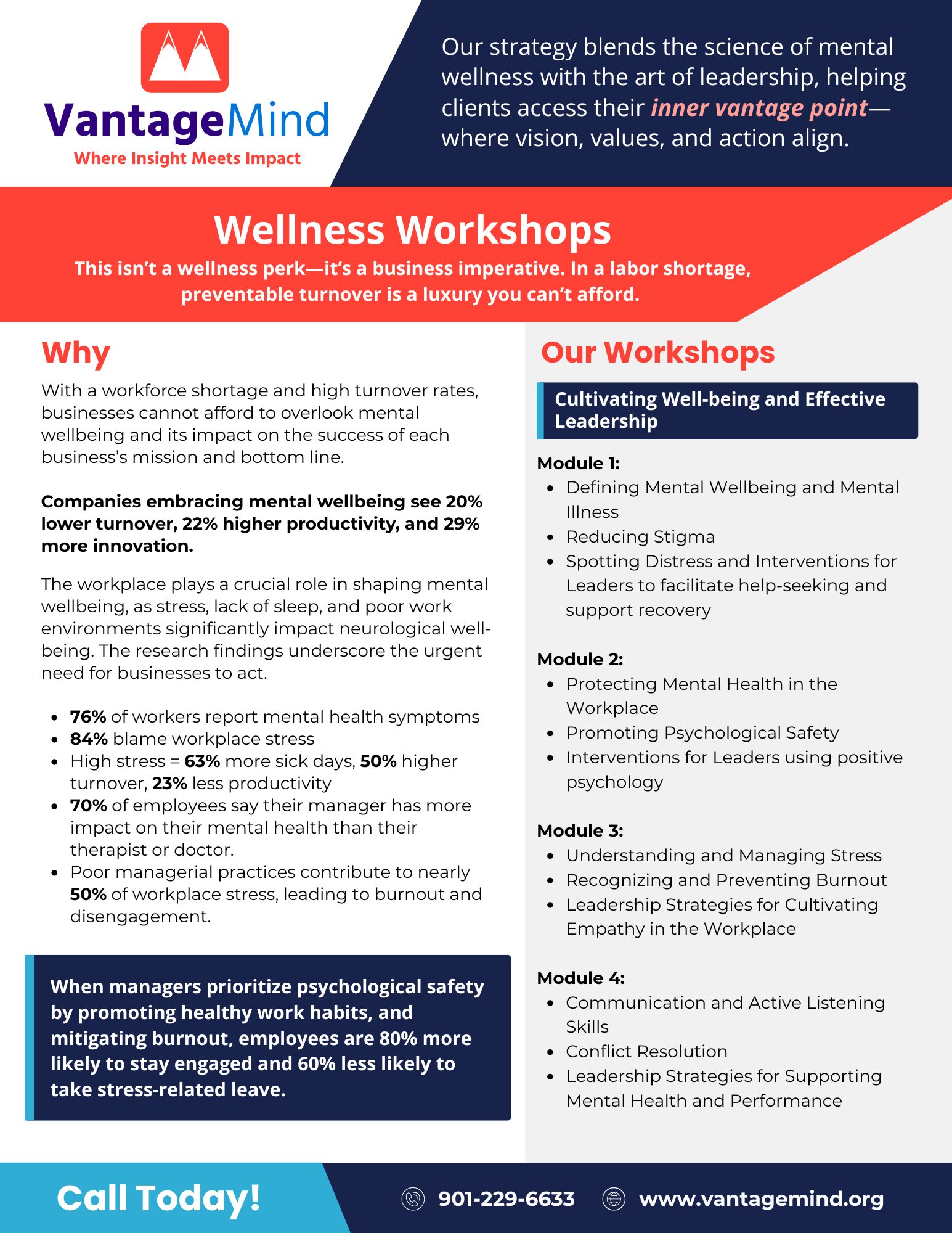 Every aspect of VantageMind is grounded in the belief that leadership begins within. When leaders are centered and self-aware, they create workplaces where others can flourish. And when organizations invest in mental wellbeing, they don’t just improve retention or productivity—they build cultures of trust, innovation, and compassion.